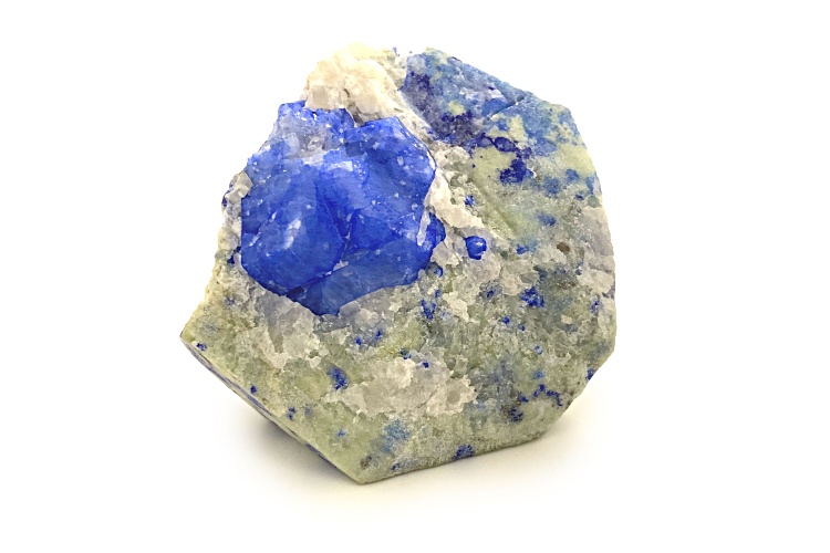 Afghan sodalite over nepheline 6.638x6.367x4.2cm mineral specimen. The specimen comes from Ladjuar Medam (Lajur Madan; Lapis-lazuli Mine; Lapis-lazuli deposit), Sar-e Sang (Sar Sang; Sary Sang), Koksha Valley (Kokscha Valley; Kokcha Valley), Khash & Kuran Wa Munjan Districts, Badakhshan Province (Badakshan Province; Badahsan Province), Afghanistan.