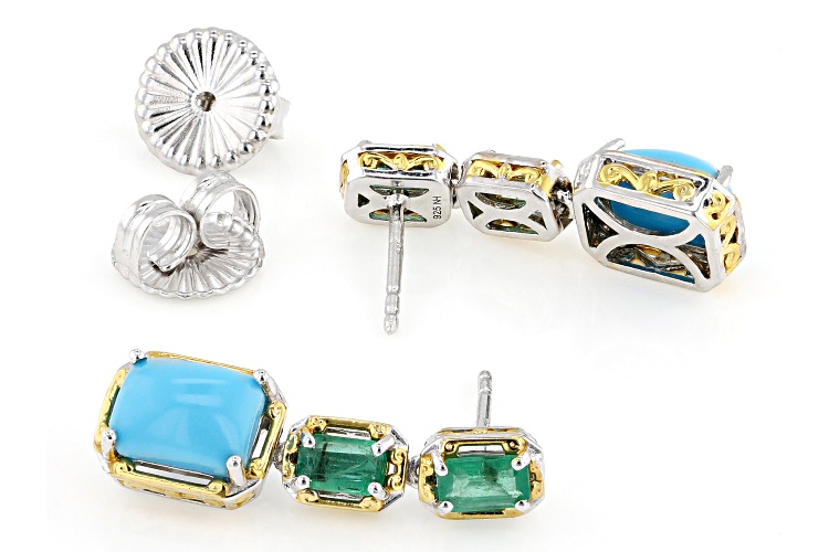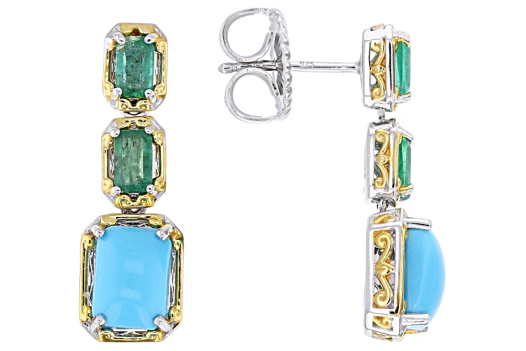Sleeping Beauty Turquoise, 1.09ctw Grizzly Emerald Rhodium/24k Gold Over Palladium Silver Earrings