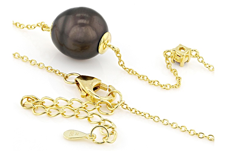 10mm Cultured Tahitian Pearl With 0.86ctw Blue Moissanite 18k Yellow Gold Over Silver 20 Inch Necklace. Measures approximately 7/16 of an inch in width and has a lobster claw clasp with a 2 inch extender. Colors, shapes, and sizes may vary.