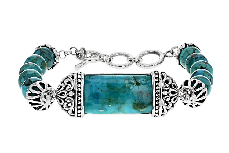 22x12mm free-form cabochon turquoise and 8mm round turquoise ball sterling silver bracelet. Measures approximately .59"W. Toggle closure. 1" extender. Oxidized finish. This product contains composite turquoise. This means separate pieces of turquoise were bound together.
