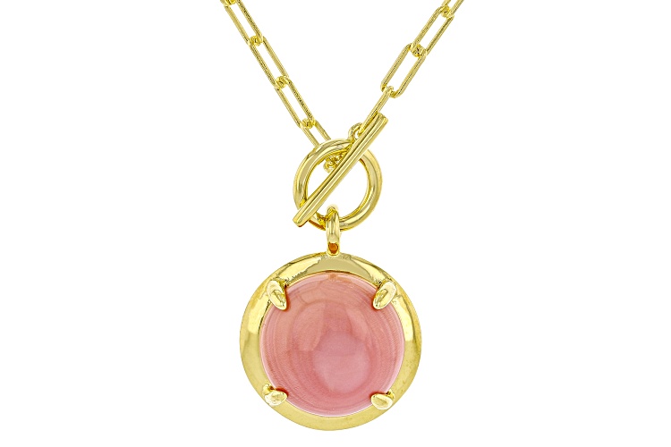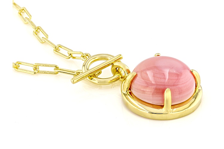 14mm Round Pink Conch Shell 18k Yellow Gold Over Sterling Silver Paper Clip Necklace. Measures Approximately 1.34"L x 0.71"W. Toggle Clasp.