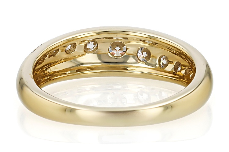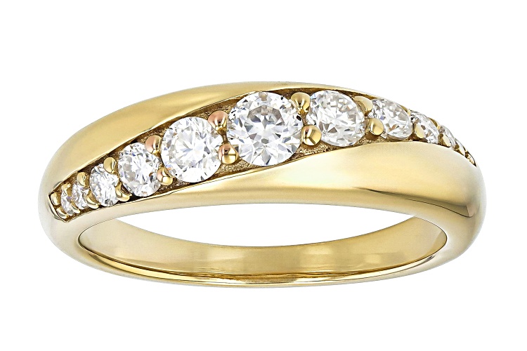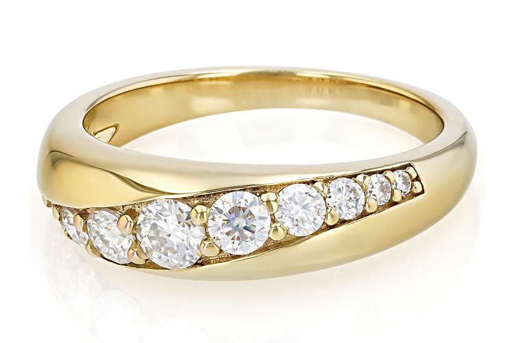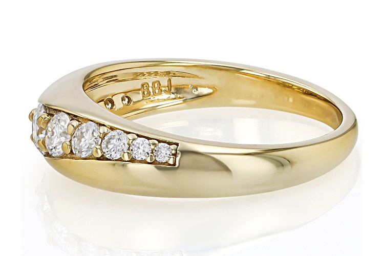 Moissanite Fire® 0.60ctw diamond equivalent weight round brilliant, 14k yellow gold over sterling silver ring. Measures approximately 13/16" L x 1/4" W and is not sizeable. Actual moissanite weight is 0.52ctw.