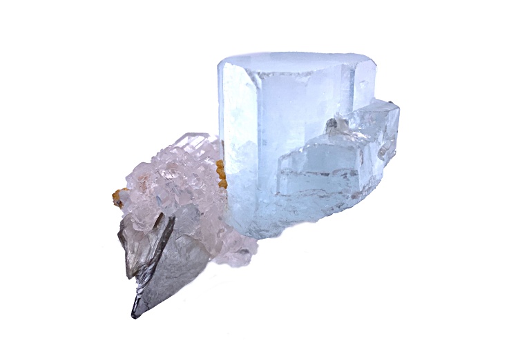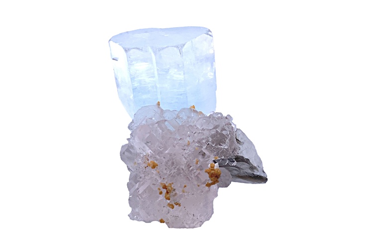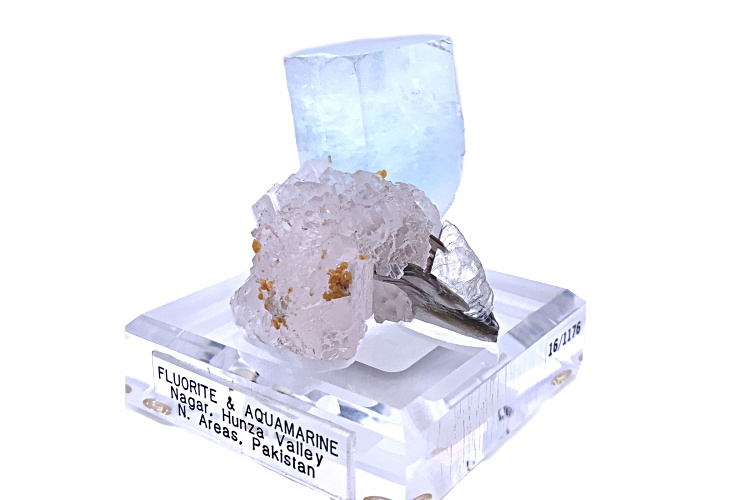 Pakistani aquamarine and fluorite 5.7x4.7x4.2 cm mineral specimen with custom base. This specimen is from Nagar, Hunza Valley, Gilgit District, Gilgit-Baltistan, Pakistan. Both crystals are floaters.