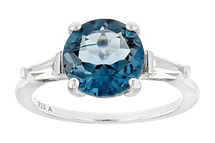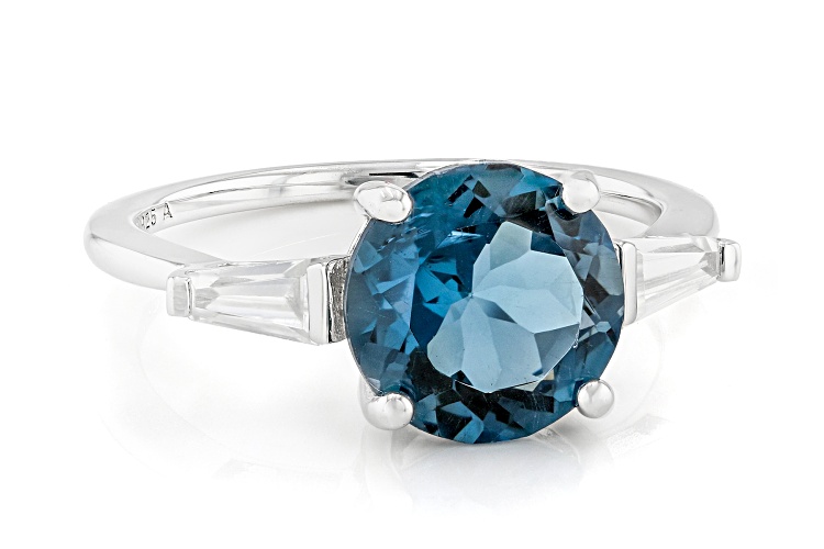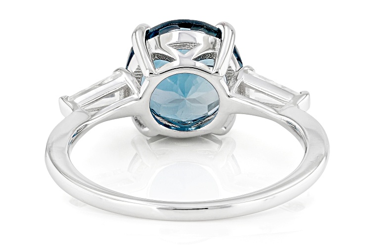 2.70ct Round London Blue Topaz and 0.30ctw Tapered Baguette White Zircon Rhodium Over Sterling Silver Ring. Measures Approximately 0.74"L x 0.35"W. Not Sizeable. Accent Stones Primarily Zircon.
