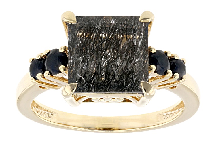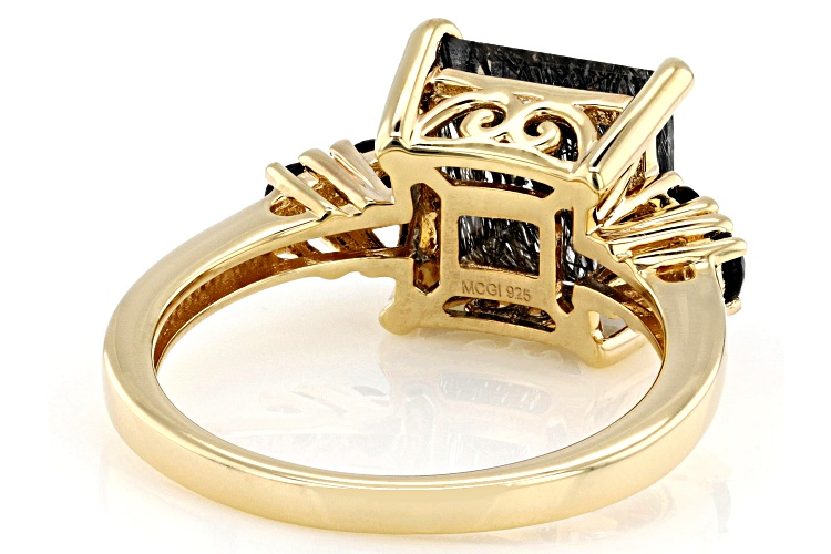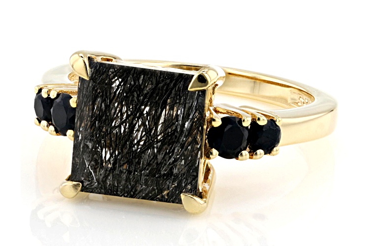 2.55ct Square Cushion Black Tourmalinated Quartz With 0.39ctw Round Black Spinel 18k Yellow Gold Over Sterling Silver Ring. Measures Approximately 0.69"L x 0.40"W. Not Sizeable.
