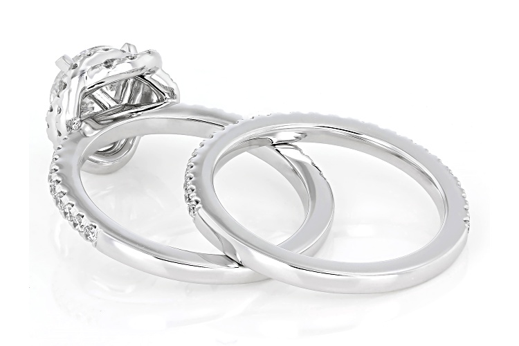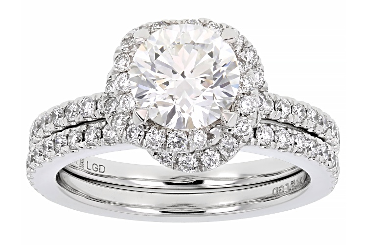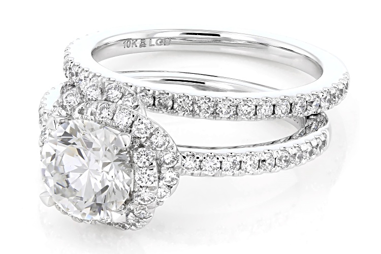 Prazana® Lab-Grown Diamonds 1.50ct round white lab-grown diamond center stone with 0.75ctw round white lab-grown diamond, rhodium over 10k white gold halo ring with matching band. Measures approximately 7/16" W x 7/16" L and is not sizeable. White rhodium enhanced prongs. G-H color, SI1 clarity minimum. Center stone is fully IGI Certified.