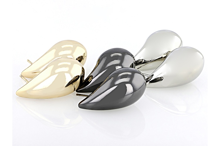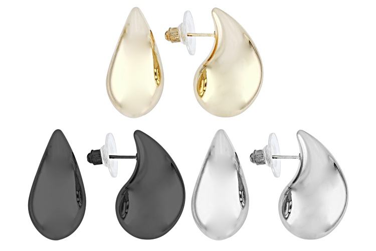 Introducing the fabulous Gold Tone, Silver Tone, Hematite Tone Set of 3 Earrings from Off Park ®Collection! These earrings are a must-have addition to your jewelry collection. The playful mix of tones adds versatility and fun to any outfit. Each earring set is carefully crafted with attention to detail that shines through in every piece. Whether you're dressing up for a special occasion or adding some flair to your everyday look, these earrings will be sure to turn heads wherever you go! Let's add some sparkle and shine into your life with this delightful trio! Measures Approximately 0.96"L x 0.51"W. Bullet Backings.