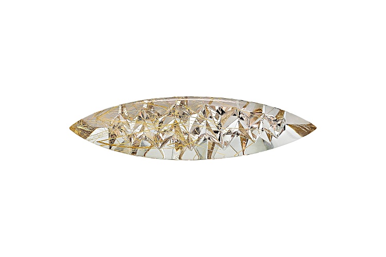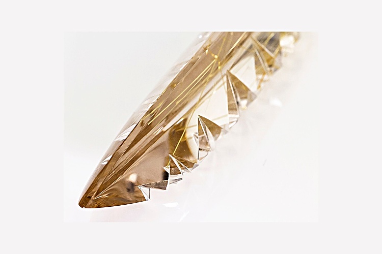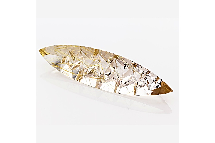 Sonja Kreis Brazilian golden rutilated quartz 120.50ct 79.87x20.62x13.85mm fancy marquise custom cut. Gemstone mined in Brazil and cut in Germany. Gemstone cut by Alexander Kreis.