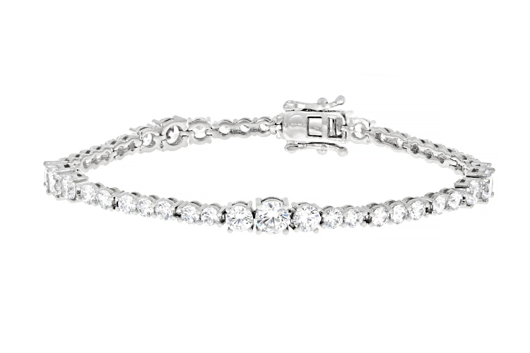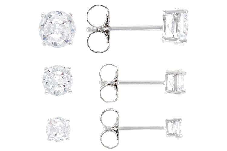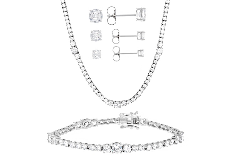 Bella Luce® 48.88ctw Round White Diamond Simulant Rhodium Over Brass Tennis Necklace, Tennis Bracelet, and 3 Stud Earrings Set of 5. Necklace measures approximately 18"L x 0.20"W with box clasp. Bracelet measures approximately 0.20" W with box clasp. Earrings measure approximately 0.16"L x 0.16"W, 0.20"L x 0.20"W, and 0.24"L x 0.24"W with push backings.
