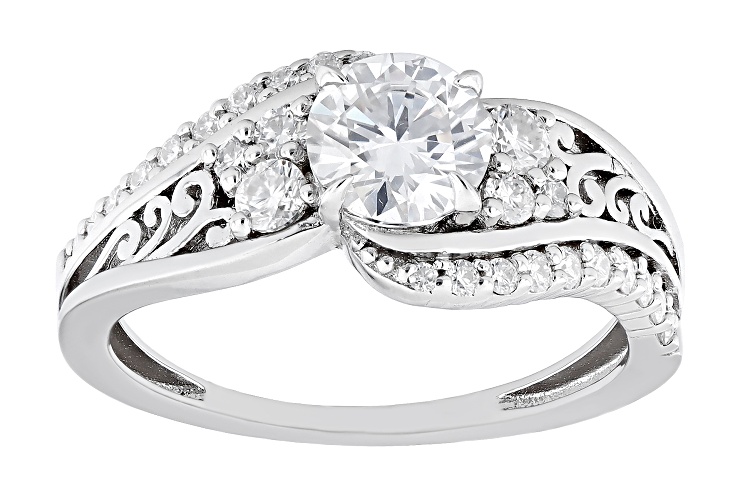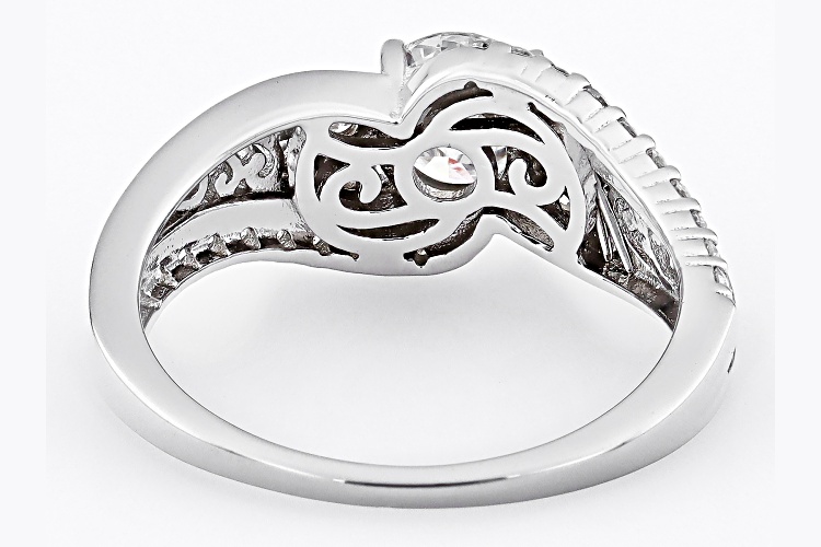 Moissanite Fire(R) 1.22ctw diamond equivalent weight round, Platineve(R) ring. Measures approximately 5/16" L x 1/16" W and is not sizeable. Actual moissanite weight is 1.04ctw.