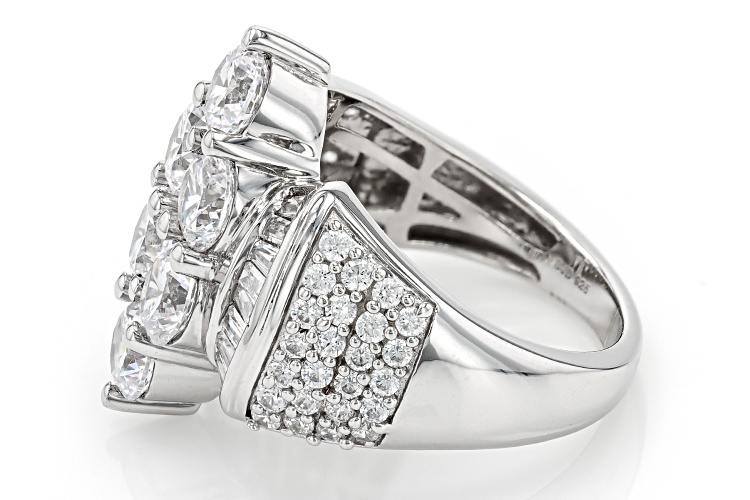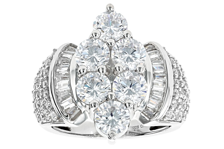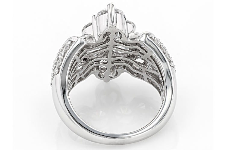 Bella Luce® white diamond simulant 6.00ctw round and baguette, rhodium over sterling silver ring. Measures approximately 0.88" L x 0.81" W and is not sizable. The diamond equivalent weight is 3.63ctw.