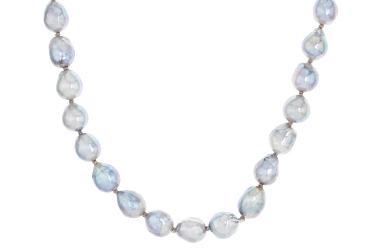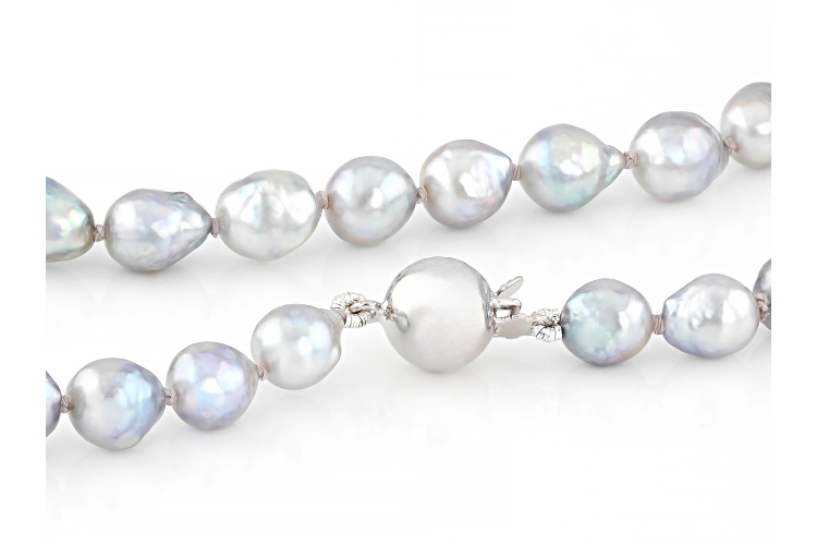 6mm Platinum Cultured Japanese Akoya Pearl Rhodium Over Sterling Silver 18 Inch Strand Necklace. Measures approximately 1/4 of an inch in width with a bead clasp. Colors, shapes, and sizes may vary.