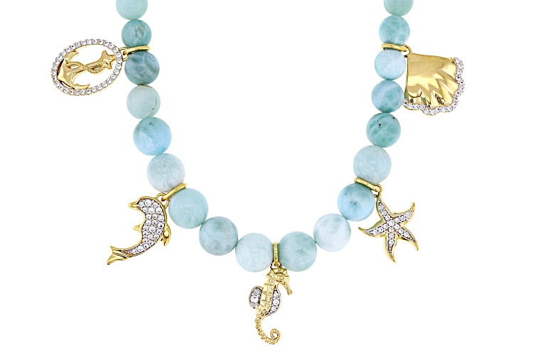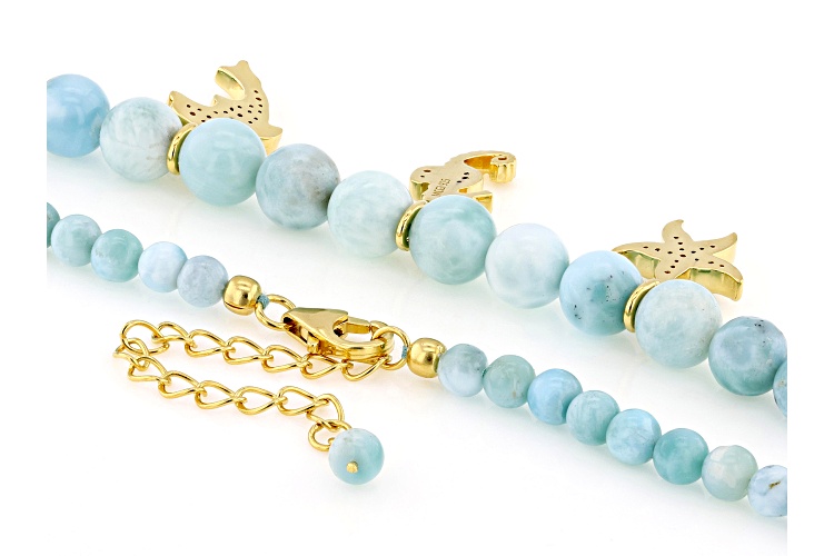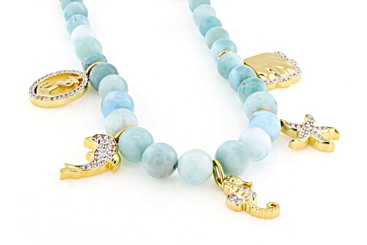 4mm-8mm Round Larimar And 0.42ctw Round Lab Created White Sapphire 18k Yellow Gold Over Sterling Silver Seaside Charm Necklace. Charms include Anchor, Dolphin, Seahorse, Starfish and Seashell. Measures Approximately 0.50"W. Lobster Claw Clasp. 2" Extender