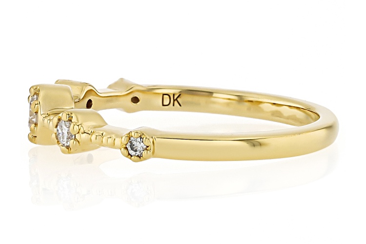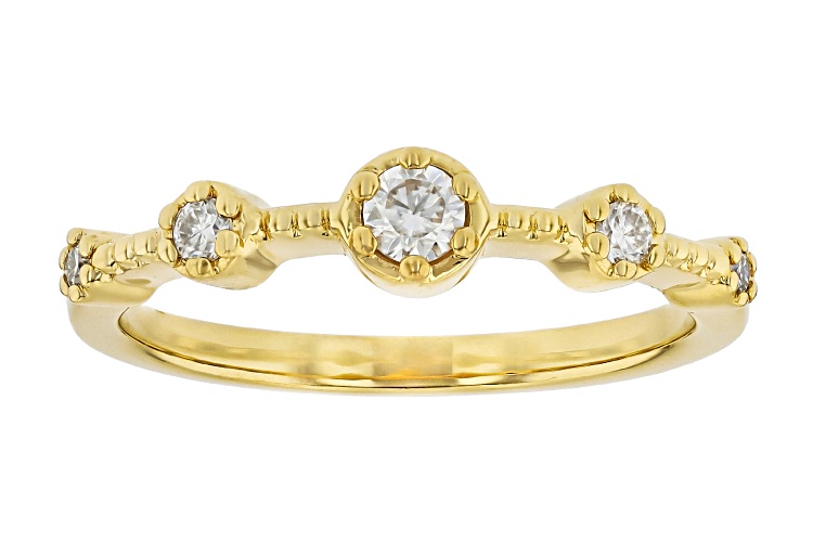 Moissanite Fire® 0.20ctw diamond equivalent weight round brilliant, 14k yellow gold over sterling silver ring. Measures approximately 3/4" L x 1/8" W and is not sizeable. Actual moissanite weight is 0.17ctw.
