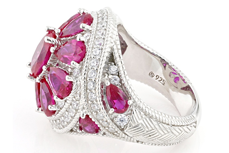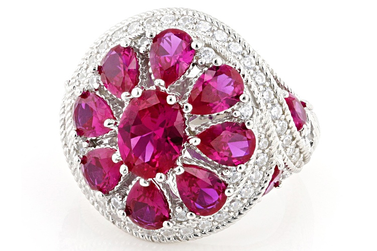 Judith Ripka 12.76ctw Oval and Pear-Shaped Lab Ruby With 1.22ctw Round White Bella Luce® Diamond Simulant Rhodium Over Sterling Silver Celebration Ring. Measures Approximately 0.89"L x 0.83"W. Not Sizeable.