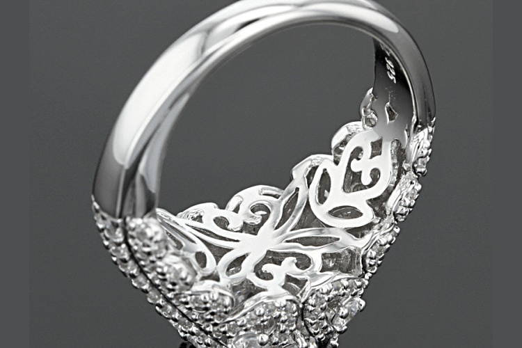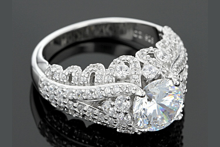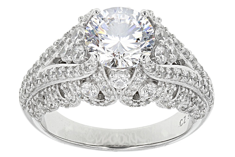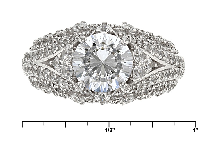Bella Luce ® Dillenium Cut white diamond simulant 5.52ctw round, rhodium over sterling silver ring. Measures approximately 7/16"L x 1/16"W and is not sizeable. The diamond equivalent weight is 3.42ctw.