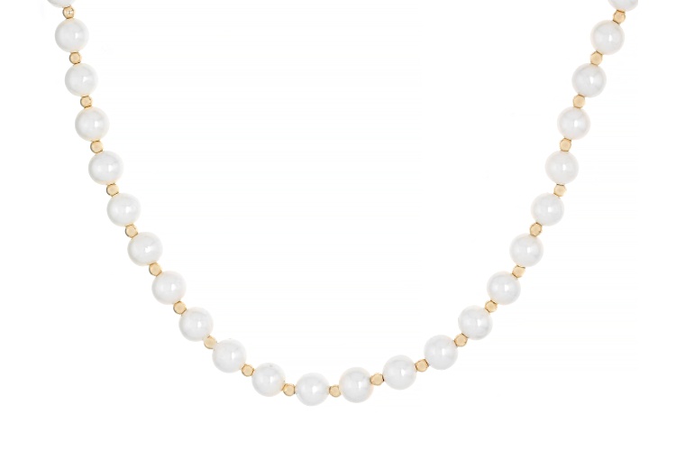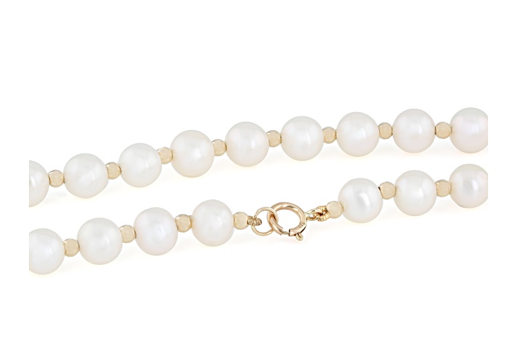 6mm White Cultured Freshwater Pearl 14k Yellow Gold 20 Inch Necklace. Measures approximately 1/4 of an inch in width and has a spring ring clasp. Colors, shapes, and sizes may vary.