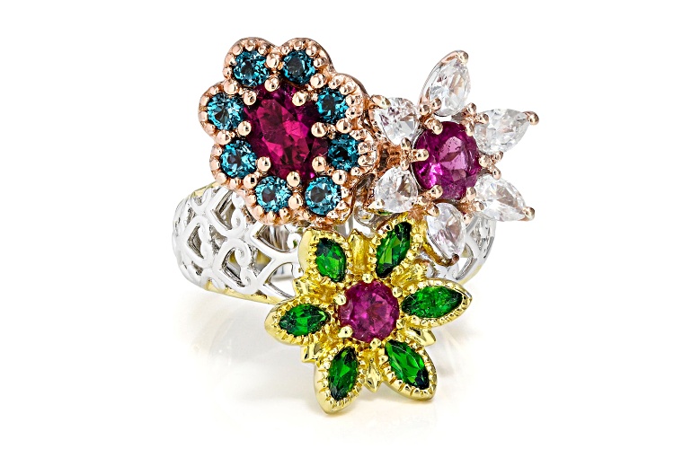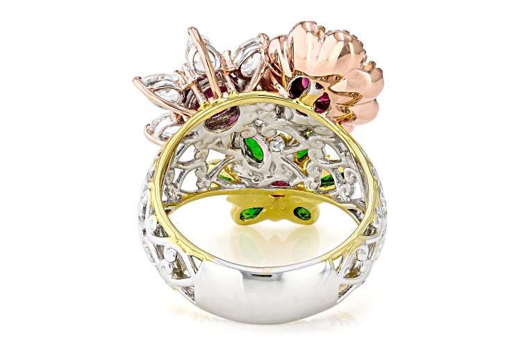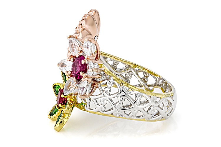 Gems En Vogue 0.72ct Oval & 0.71ctw Round Rubellite With 0.64ctw Round London Blue Topaz, 0.60ctw Marquise Chrome Diopside And 1.13ctw Pear Shape White Zircon Rhodium And 18k Rose, 24k Yellow Gold Over Palladium Sterling Silver Tri-Tone Flower Ring. Measures approximately 1.16"L x 1.04"W. Not Sizeable.