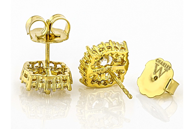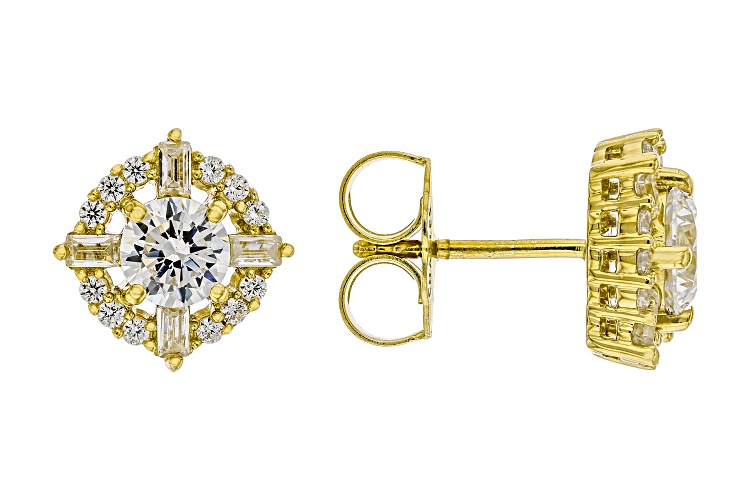 Charles Winston For Bella Luce® white diamond simulant 3.66ctw round and baguette, Eterno™ 18k yellow gold over sterling silver studs. Measures approximately 0.52" L x 0.52" W and has pushback backings. The diamond equivalent weight is 2.21ctw.