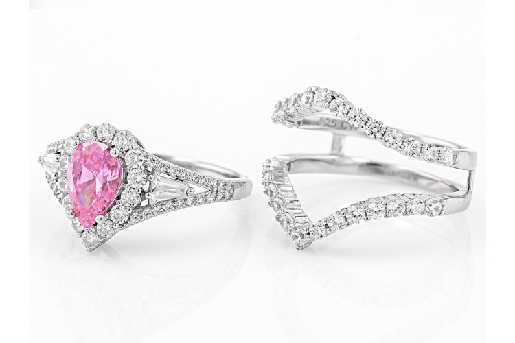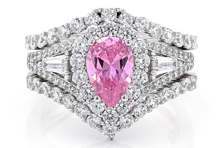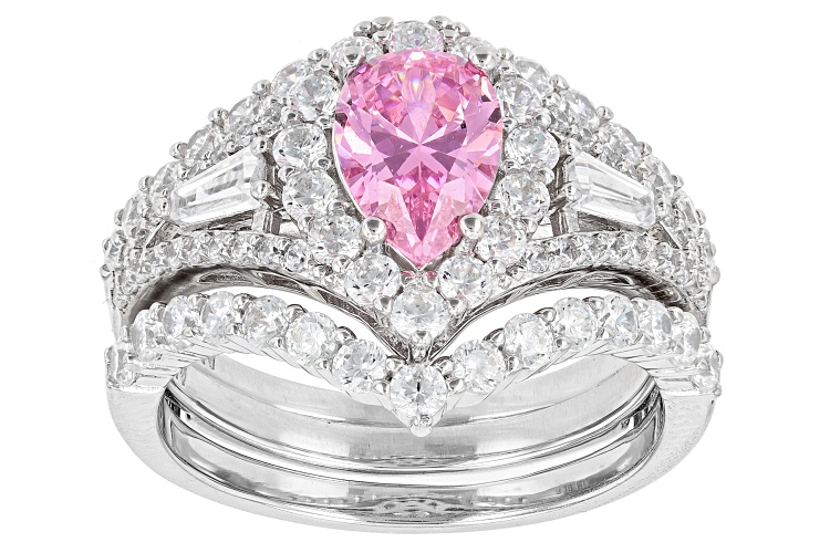 Charles Winston for Bella Luce® pink and white diamond simulants 5.01ctw baguette, pear, and round, rhodium over sterling silver ring set. Measures approximately 0.81" L x 0.69" W and is not sizable. The diamond equivalent weight is 3.03ctw.
