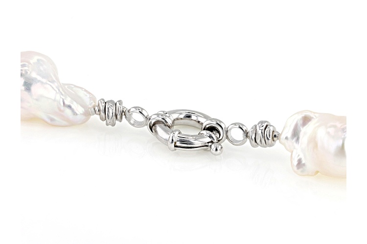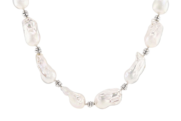 Genusis™ 13-15mm White Cultured Freshwater Pearl Rhodium Over Sterling Silver 20 Inch Strand Necklace. Measures approximately 9/16 of an inch in width and has a spring ring clasp. Colors. shapes, and sizes may vary.