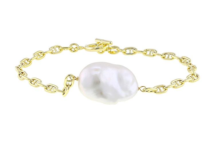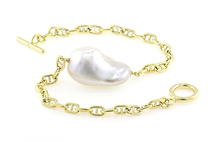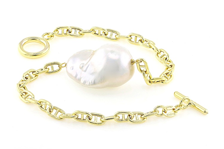 Genusis™ 15-16mm White Cultured Freshwater Pearl 18k Yellow Gold Over Sterling Silver Bracelet. Measures approximately 5/8 of an inch in width and has a toggle clasp. Colors, shapes, and sizes may vary.