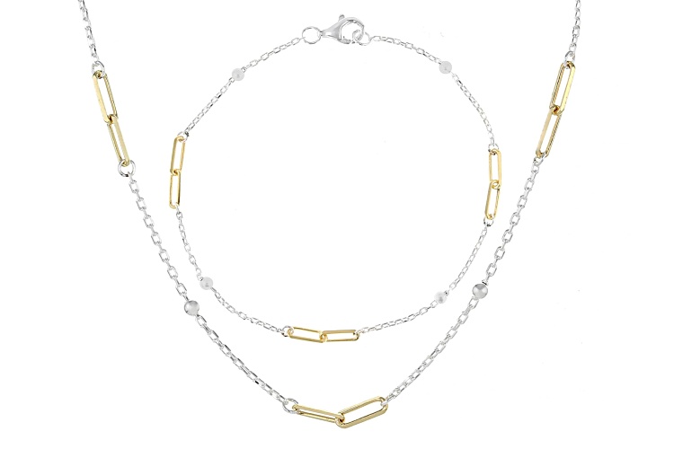 18k Gold Over Sterling Silver Two-Tone 3mm Paperclip/Bead Station 18" Necklace and 7.25" Bracelet Set of 2. Lobster Claw Clasp Closure.