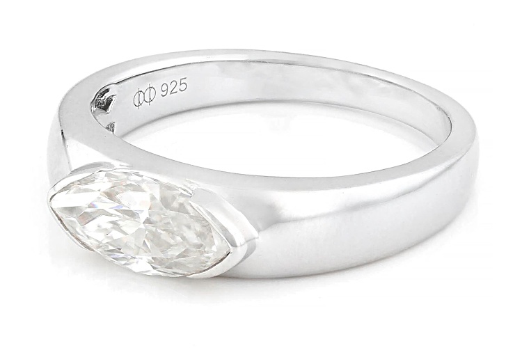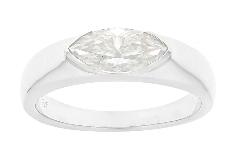 Moissanite Fire® 1.00ct diamond weight marquise, Platineve® ring. Measures approximately 7/16"L x 3/16"W and is not sizeable. Actual moissanite weight is 0.90ct.