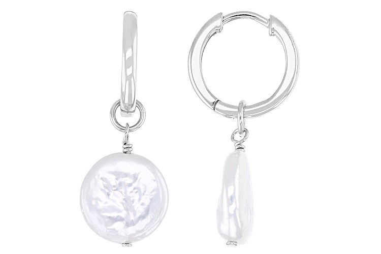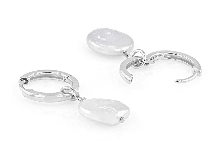 9mm White Cultured Freshwater Pearl Rhodium Over Sterling Silver Earrings. Measures approximately 1 1/8" L x 7/16" W and have hinged notch post backings backings. Colors, shapes, and sizes may vary.