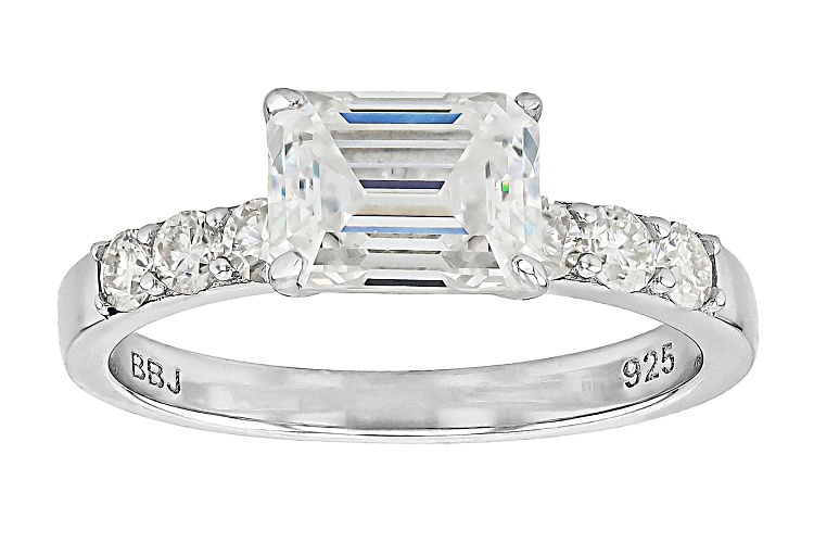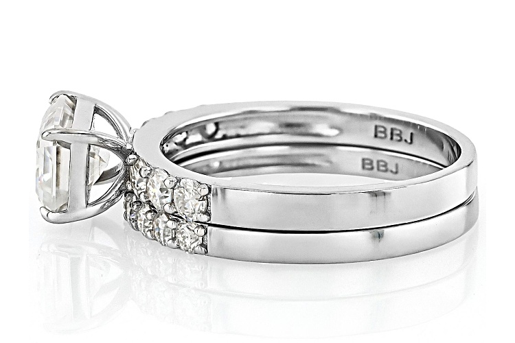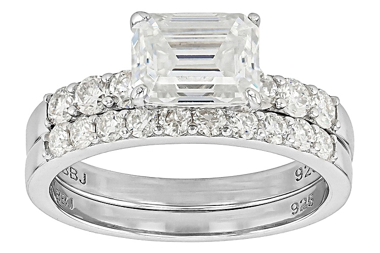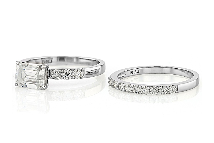 Moissanite Fire® 2.41ctw diamond equivalent weight emerald cut and round brilliant, Platineve® ring and band. Measures approximately 3/4"L x 1/4"W and is not sizeable. Actual moissanite weight is 2.20ctw.