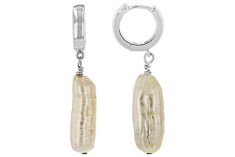 White Cultured Freshwater Pearl Rhodium Over Sterling Silver Earrings. Measures approximately 1 1/4" L x 1/4" W and have hinged backings. Colors, shapes, and sizes may vary.