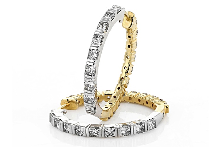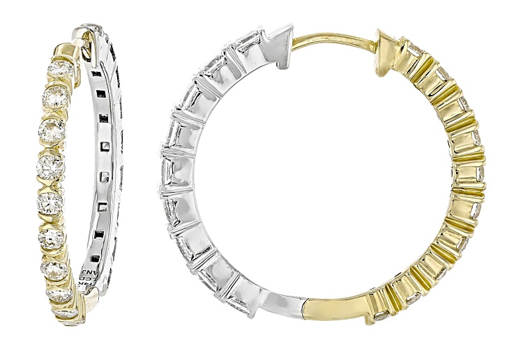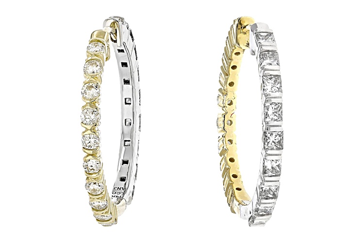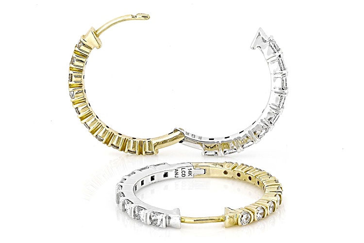 Prazana® Lab-Grown Diamonds 0.90ctw princess cut white lab-grown diamond and 0.70ctw round white lab-grown diamond, 14k yellow gold and rhodium over 14k white gold reversible hoop earrings. Measure approximately 7/8"L x 1/16"W and have hinge with notched post backings. F color, SI clarity minimum.