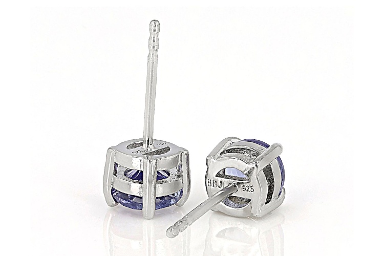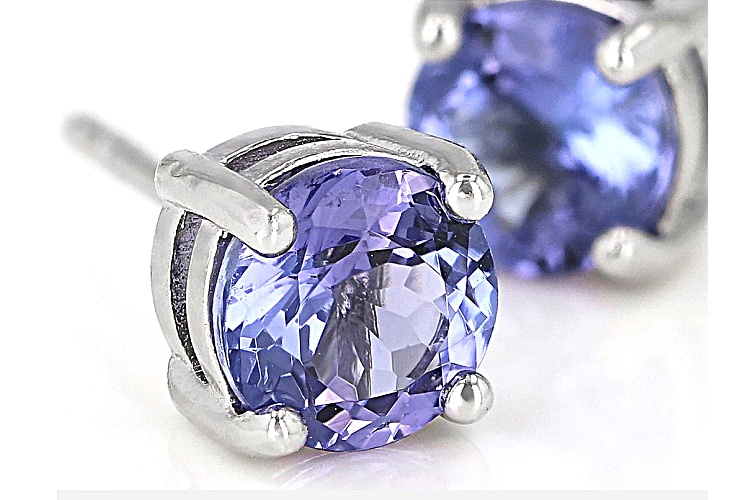 • Tanzanite Round 5.50mm Rhodium Over Sterling Silver Solitaire Stud Earrings 1.11ctw
