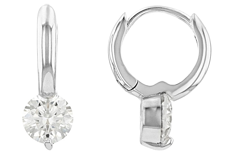 Moissanite Fire® 2.00ctw diamond equivalent weight round, Platineve® earrings. Measures approximately 11/16" L x 1/4 W and have hinged backs. Actual moissanite weight is 1.76ctw.