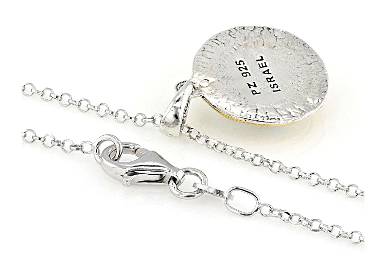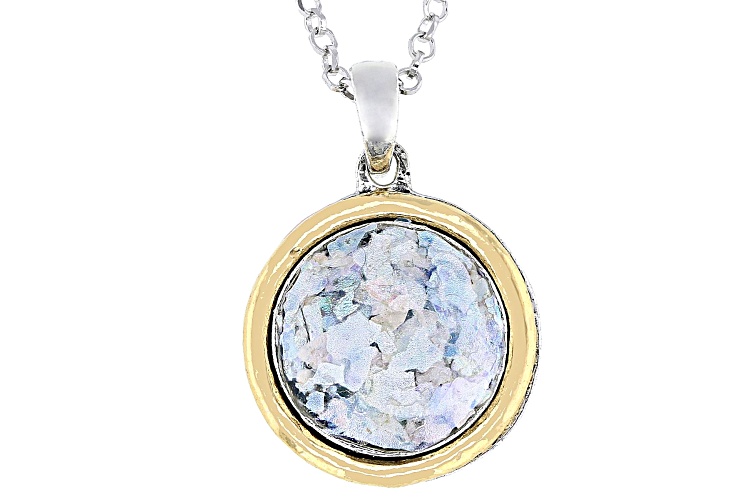 Artisan Collection of Israel™ 12mm Roman Glass Two-Tone Sterling Silver & 14K Gold Over Silver Pendant With 18" Rolo Chain. Pendant Measures Approximately 1.0"L x 0.68"W.
