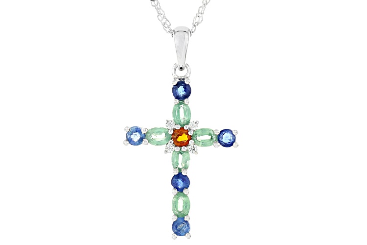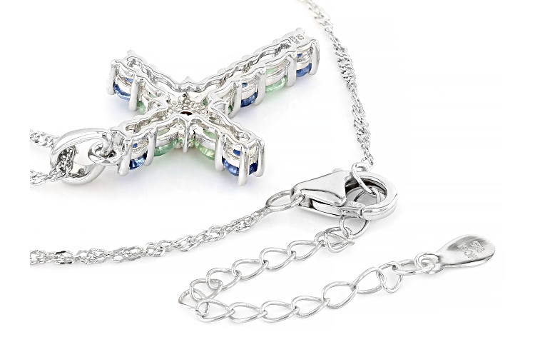 .14ct Round Orange Kyanite, 0.68ctw Blue Kyanite, .99ctw Oval Green Kyanite With .07ctw Round White Zircon Rhodium Over Sterling Silver Cross Pendant With 18"Singapore Chain. Measures Approximately 1.37"L x 0.73"W. 2.5mm bail. Lobster clasp with 2"extender. Accent stones primarily zircon.