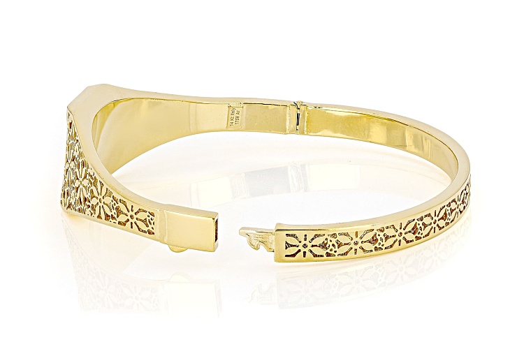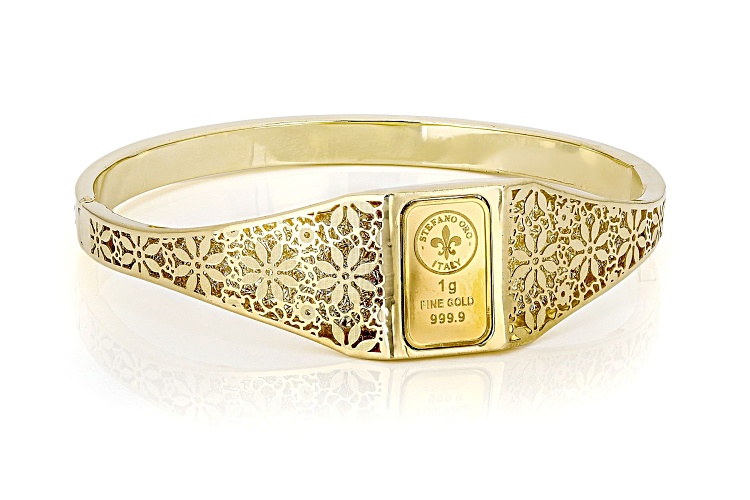 Stefano Oro® 24k Yellow Gold 1g Classic Ingot on 14k Yellow Gold Ricami Bangle. Measures Approximately 5/8"W at Ingot. Approximately 3/16"W Around Back of Bangle. Hinge Closure with Push Button Lock.