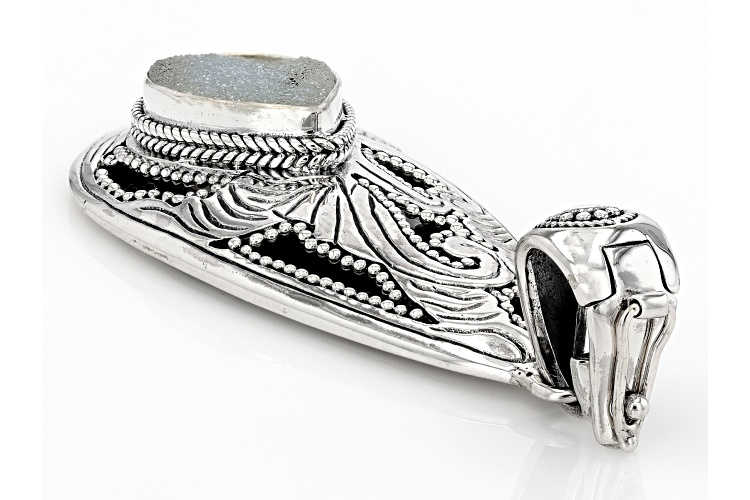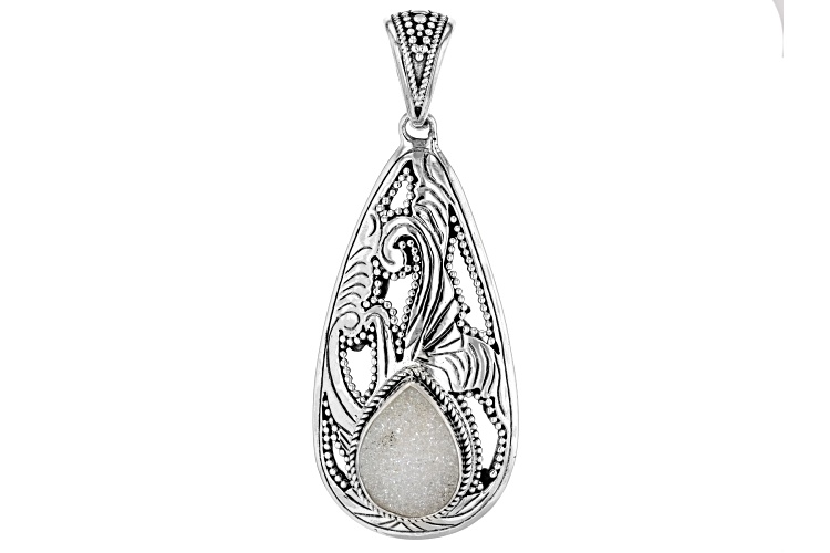 Artisan Collection of Bali™ 16x12mm Pear Shaped White Drusy Quartz Sterling Silver Enhancer Pendant. Oxidized. Measures Approximately 2.51"L x 0.98"W.
