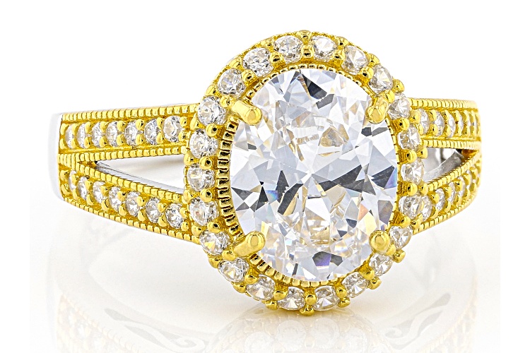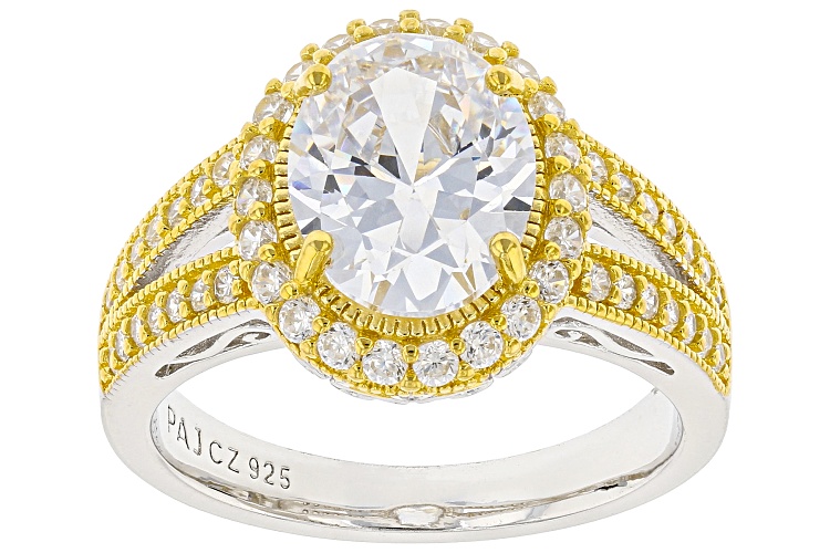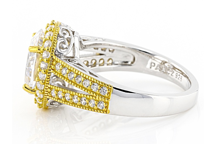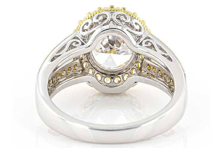 Bella Luce® white diamond simulant 4.77ctw oval and round, rhodium and Eterno™ 18k yellow gold over sterling silver ring. Measures approximately 0.81" L x 0.50" W and is not sizable. Diamond equivalent weight is 2.89ctw.