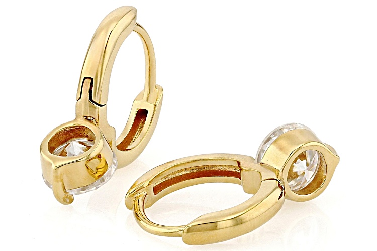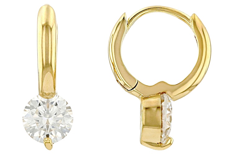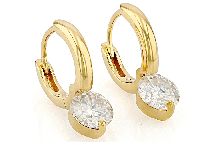 Moissanite Fire® 2.00ctw diamond equivalent weight round, 14k yellow gold over sterling silver earrings. Measures approximately 11/16" L x 1/4 W and have hinged backs. Actual moissanite weight is 1.76ctw.