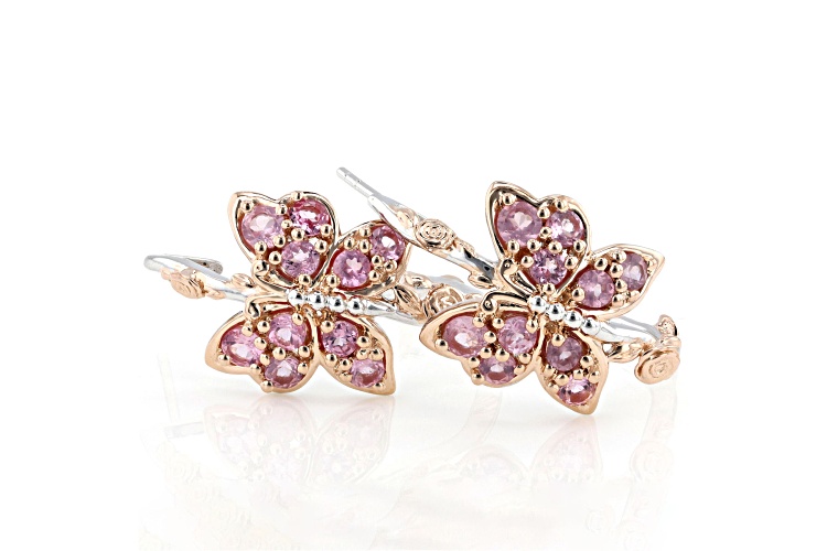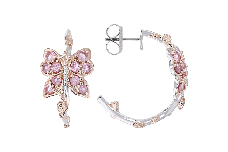 Gems En Vogue 2.81ctw Round Pink Spinel Rhodium And 18k Rose Gold Over Palladium Sterling Silver Two-Tone Butterfly Hoop Earrings. Measure approximately 1.13"L x 0.64"W. Butterfly backings.