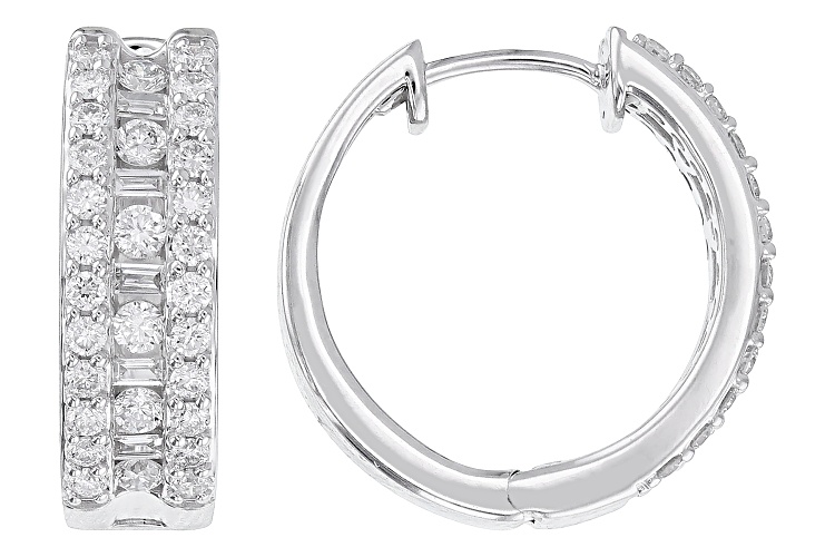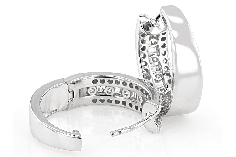 Prazana® Lab-Grown Diamonds 1.00ctw baguette and round white lab-grown diamond, rhodium over sterling silver hoop earrings. Measure approximately 11/16"L x 3/16"W and have hinge with notched post backings. H color, SI clarity minimum.