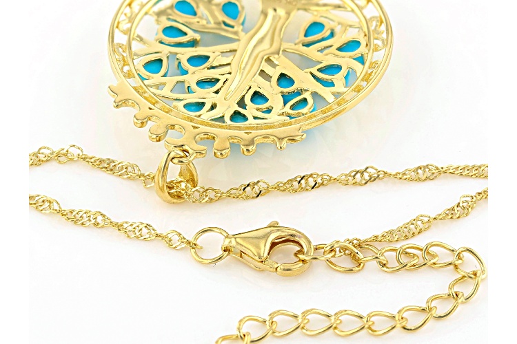 4x3mm Pear Shaped Cabochon Sleeping Beauty Turquoise 18k Yellow Gold Over Silver Tree of Life Pendant With 18" Singapore Chain. Measures Approximately 1.46"L x 1.09"W And 2mm Bail. Lobster Clasp with 2"extender.