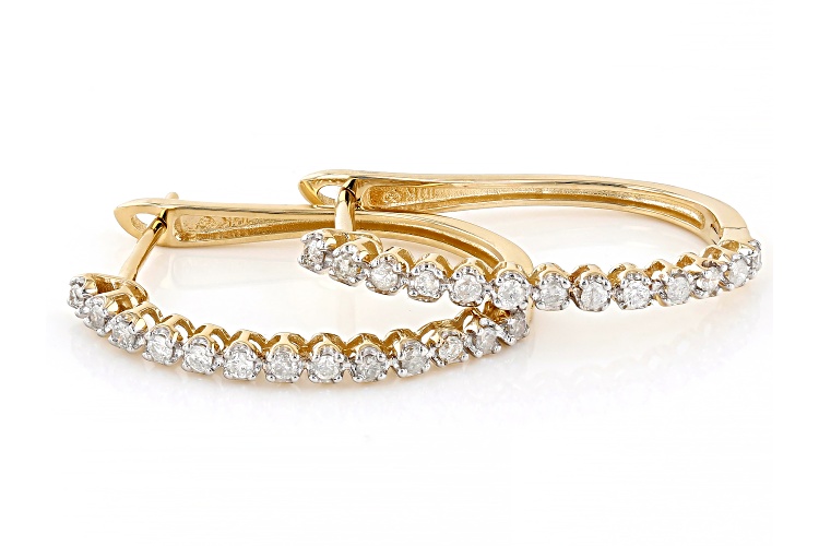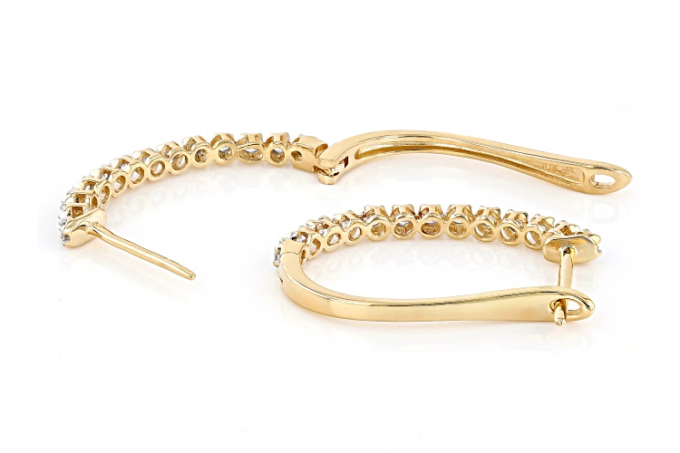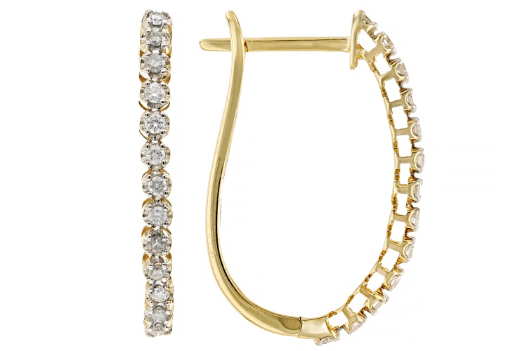 0.25ctw round white diamond, 10k yellow gold hoop earrings. Measure approximately 15/16"L x 1/16"W and have hinge with notch post backings.