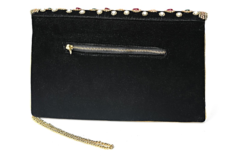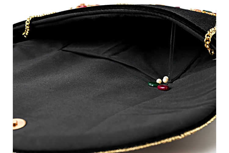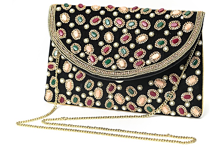 Off Park® Collection, Multi-Color Crystal & Pearl Simulant Gold Tone Black Clutch. Measures Approximately 7.5"L x 11.0"W. Snap closure. Includes 48"L Removable chain