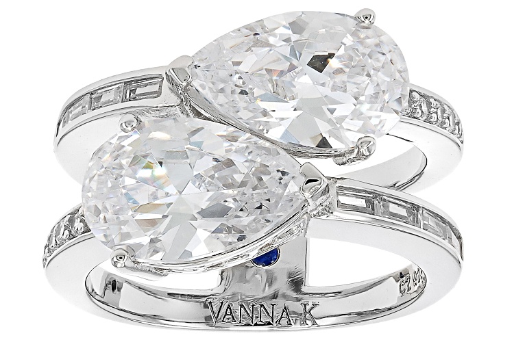 Vanna K™ for Bella Luce® white diamond simulant 9.85ctw pear, baguette, and round, Platineve® ring. Measures approximately 0.81" L x 0.50" W and is not sizable. The diamond equivalent weight is 5.96ctw. Each Vanna K™ design has a signature label that features a lab created sapphire.