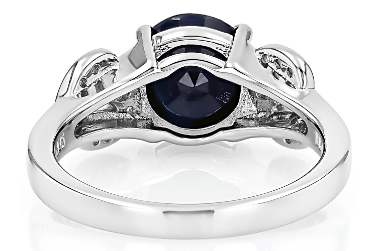 2.66ct Oval Blue Sapphire With 0.12ctw Round Lab Created White Sapphire Rhodium Over Sterling Silver Ring. Measures Approximately 0.36"L x 0.35"W. Not Sizeable.