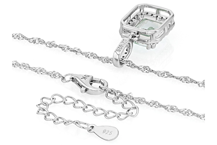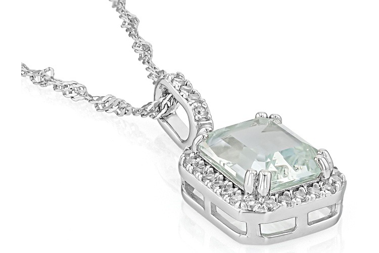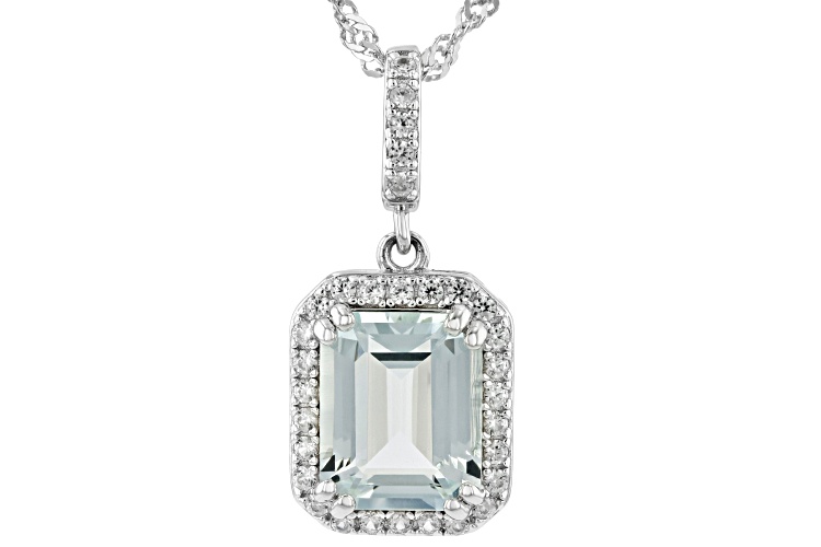 2.55ct Rectangular Octagonal Aquamarine with 0.42ctw Round White Zircon Rhodium Over Sterling Silver Pendant with Chain. Measures Approximately 0.95"L x 0.44"W. 18" Singapore Chain with 2" Extender. Lobster Claw Clasp. Accent Stones Primarily Zircon.