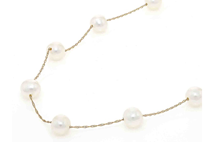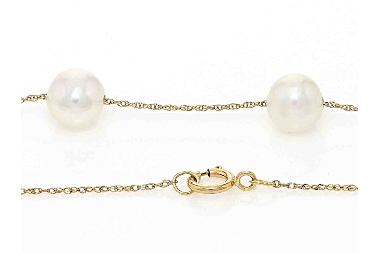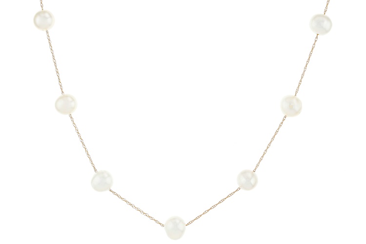 6-7mm White Cultured Freshwater Pearl 14k Yellow Gold Station Necklace. Measures Approximately 1/4 of an inch in width and has a spring ring clasp. Colors, shapes, and sizes may vary.