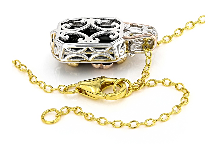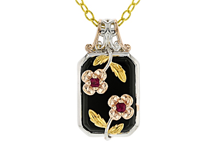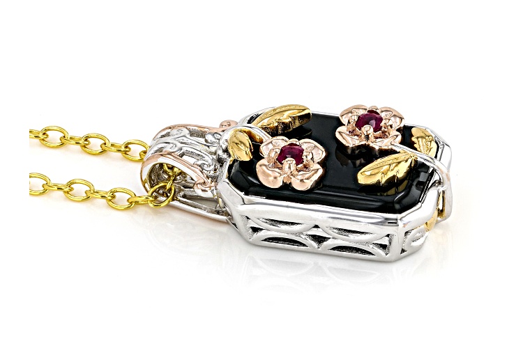 .08ctw Ruby, 14x10mm Black Onyx Rhodium/18k/24k Gold Over Palladium Silver Pendant/Chain